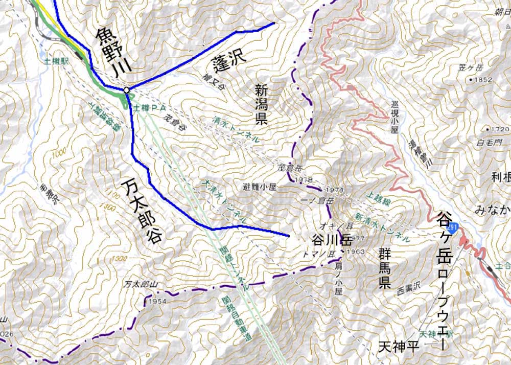 | 魚野川源流は谷川岳西斜面ならびに北斜面から流れ出る万太郎谷、蓬沢,茂倉谷、毛渡沢が合流して流れ出ている 、そのうち谷川岳から流れ出る万太郎谷が一番長いようだ |