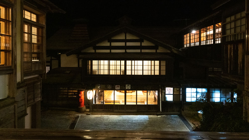 | 法師温泉の夜の玄関 | 法師温泉夜のたたずまい |