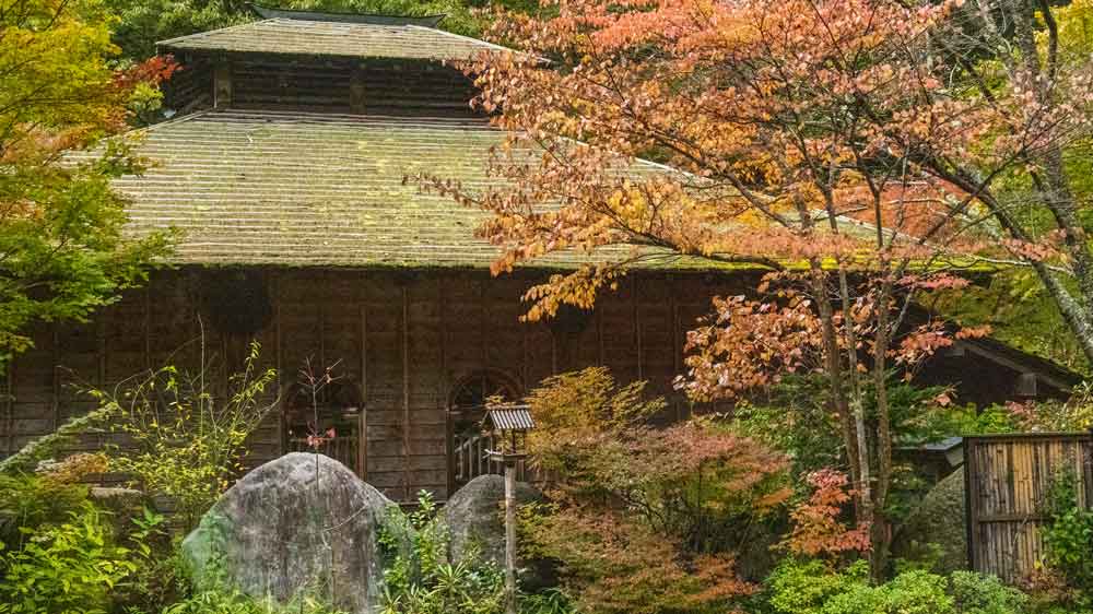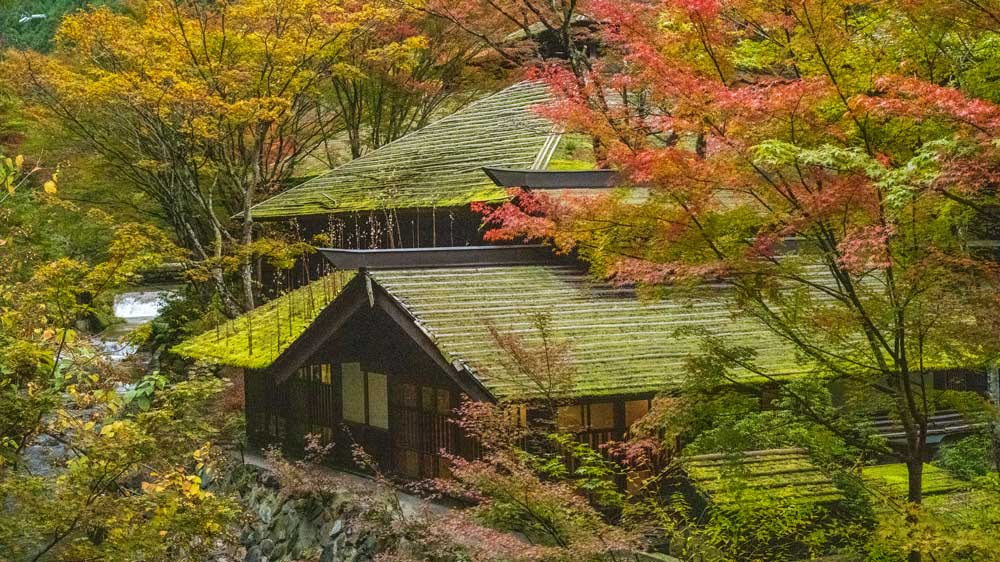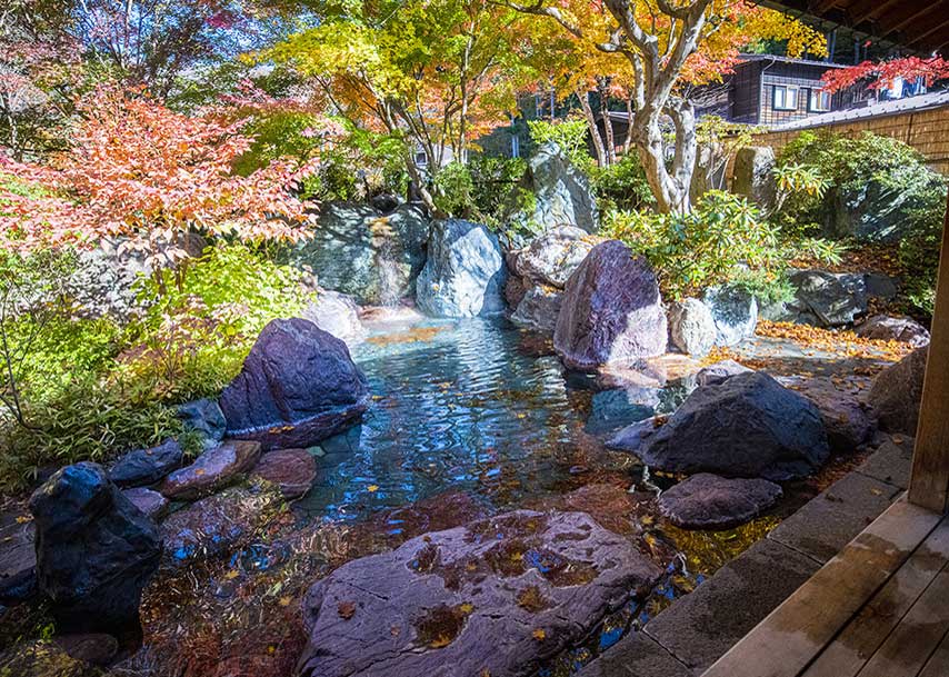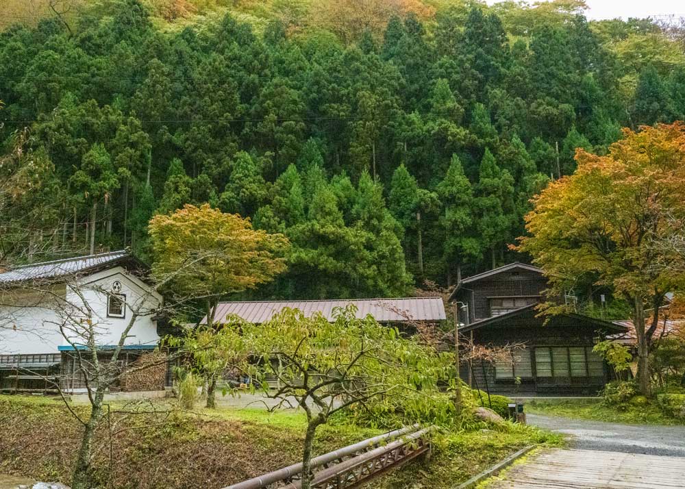 | 木造部屋の周りは杉の森に囲まれている | 温泉中の清流と紅葉 |