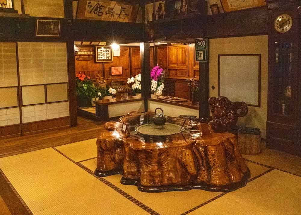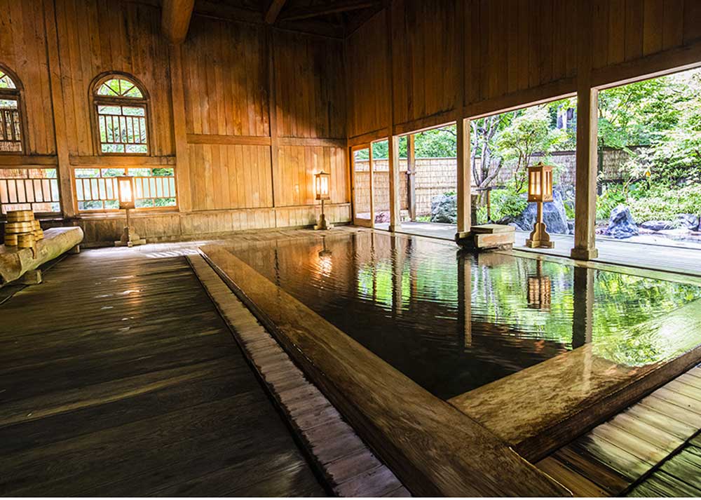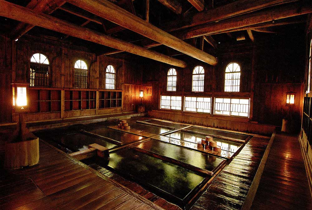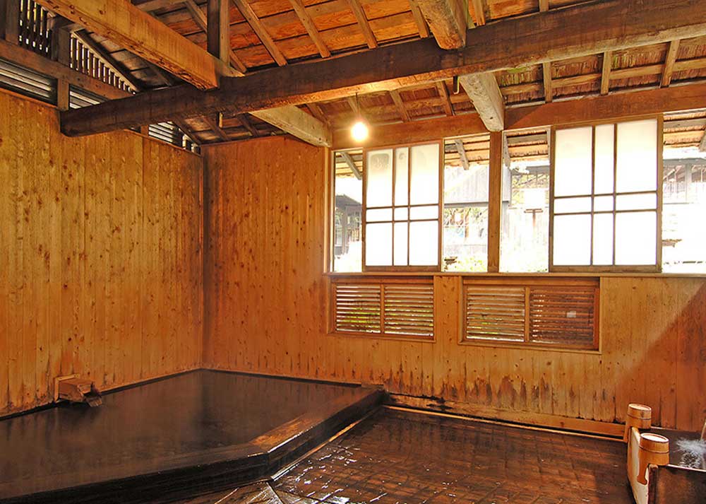 宿の象徴「法師の湯」は明治28年に建てられた和洋折衷の趣ある内湯で、4つの湯船に湯底から湧き出る源泉で満たされている。