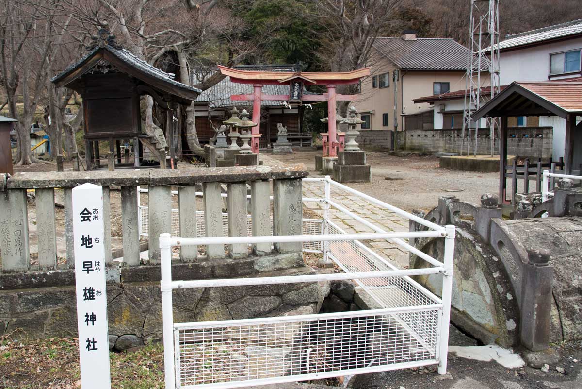 宮前橋の標識がある宿場南端にある会地早雄(おうぢはやお)神社