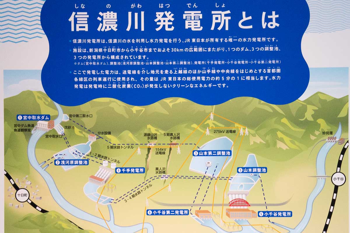 JR東日本・信濃川発電所は宮中取水ダム、浅河原調整池、千手発電所、山本調整池、小千谷発電所、山本第二調整池、小千谷第二発電所で構成されている。