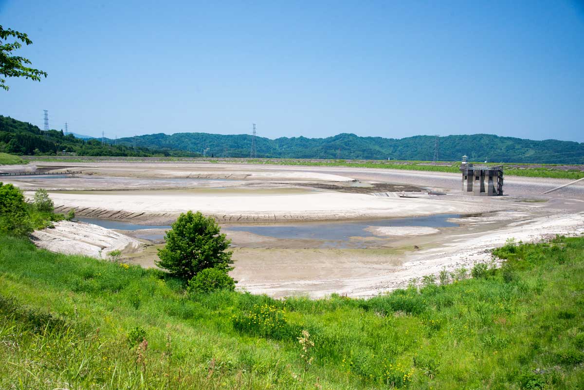 | 山本第二調整池 何故か水が抜かれていた | 山本第二調整池への流入口 |