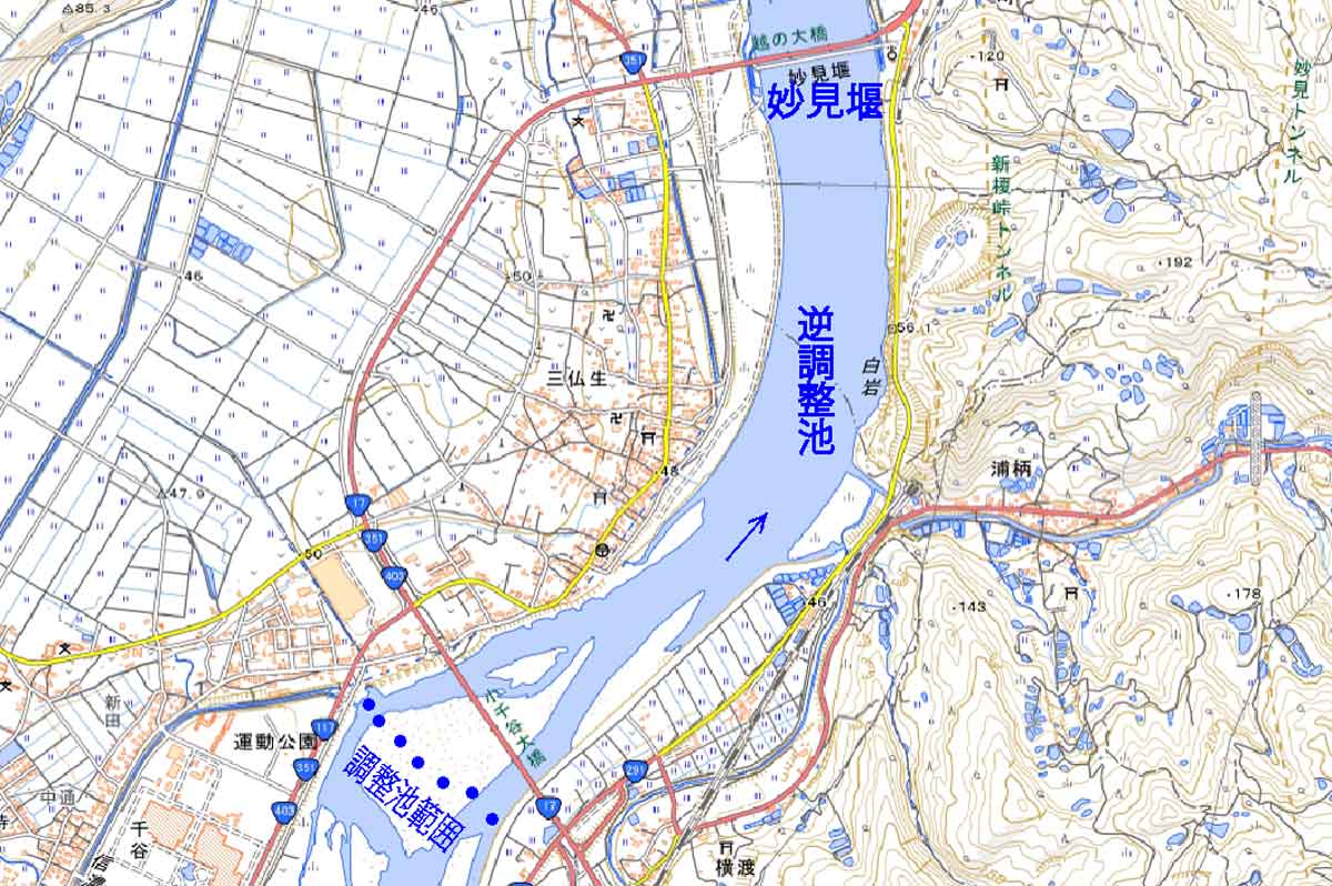 これに伴い信濃川の水位が急激に変動するため、その影響範囲を最小限にする緩衝施設として、当時の建設省との共同事業として妙見堰が建設された。