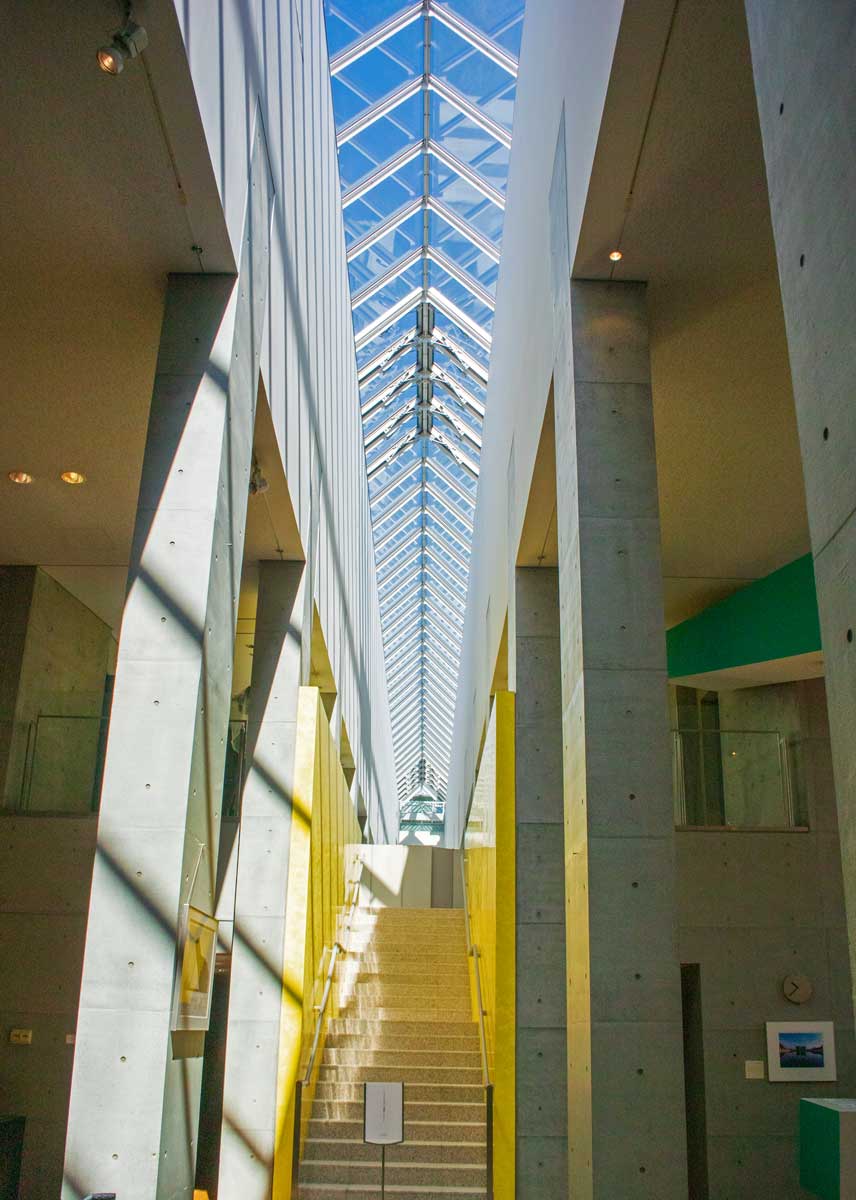 | 高い天井から階段に外光が降り注ぐ | 「鉄道愛」展を開催中 |