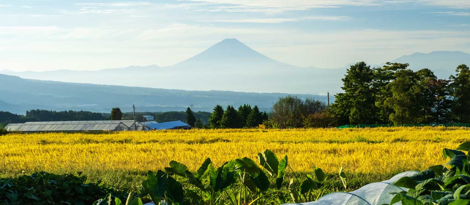 | 大泉町谷戸から黄金色の田んぼの先に富士山を望む |