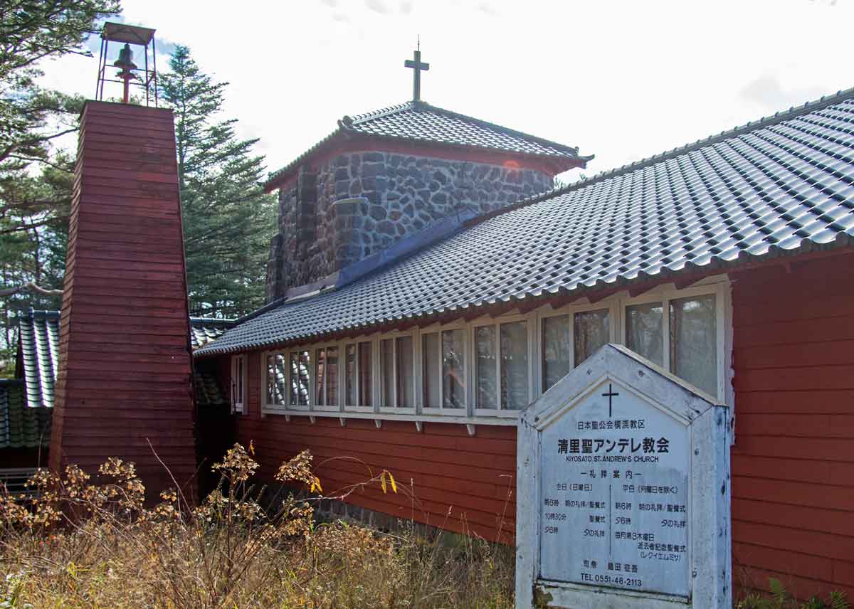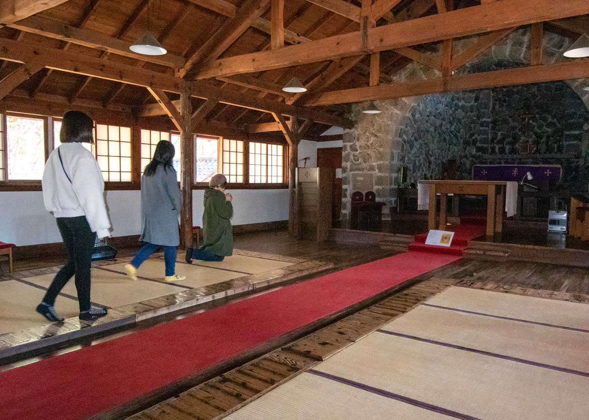 | 清里聖アンデレ教会 十字架の建物は石造り | 教会の内部は畳敷き 2020/3 |