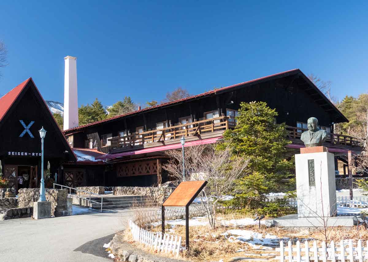 | 清泉寮の前にあるポールラッシュの胸像 は富士山に向かって建っている | 清泉寮のたたずまいは昔のままだが、この後方 に新しいホテルとレストランができた |