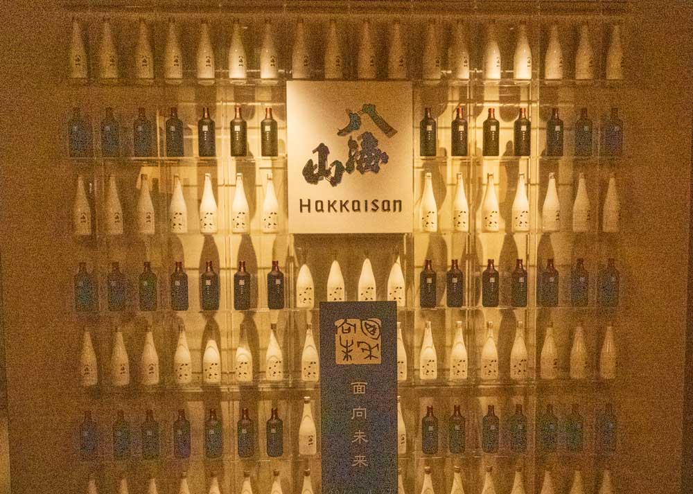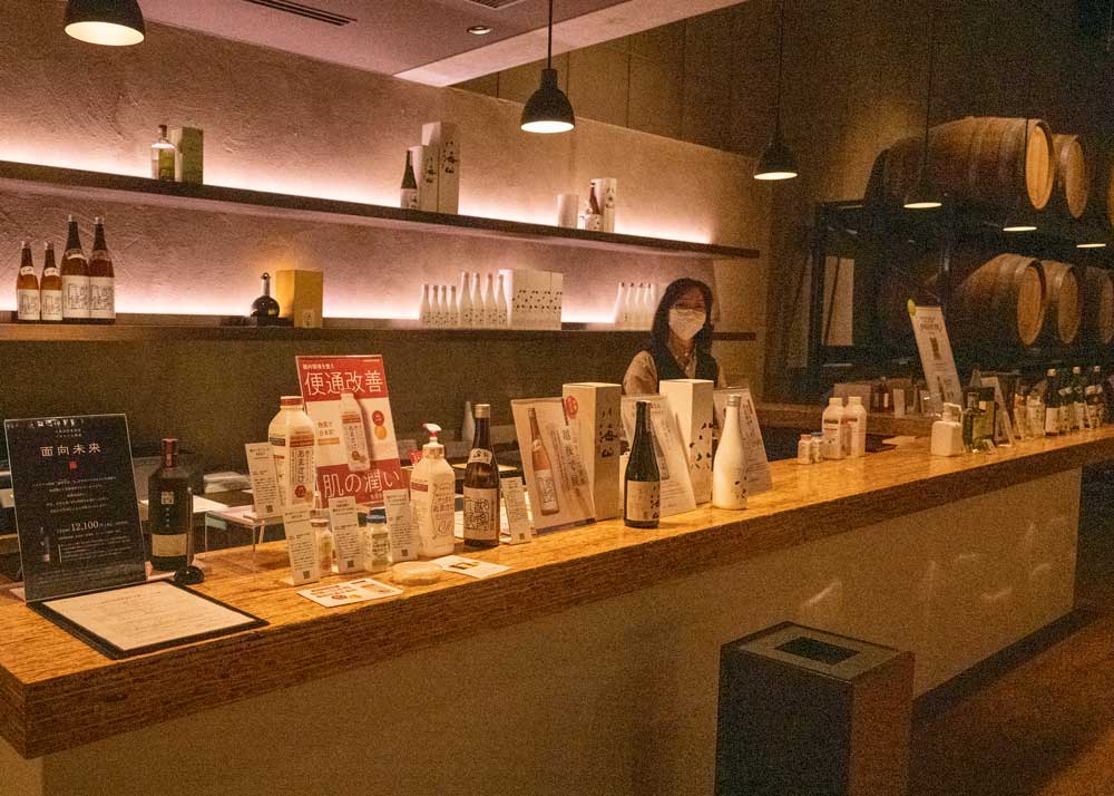 | 清酒と焼酎瓶が並ぶ棚の前に撮影ができる | 雪室見学後に試飲ができる |