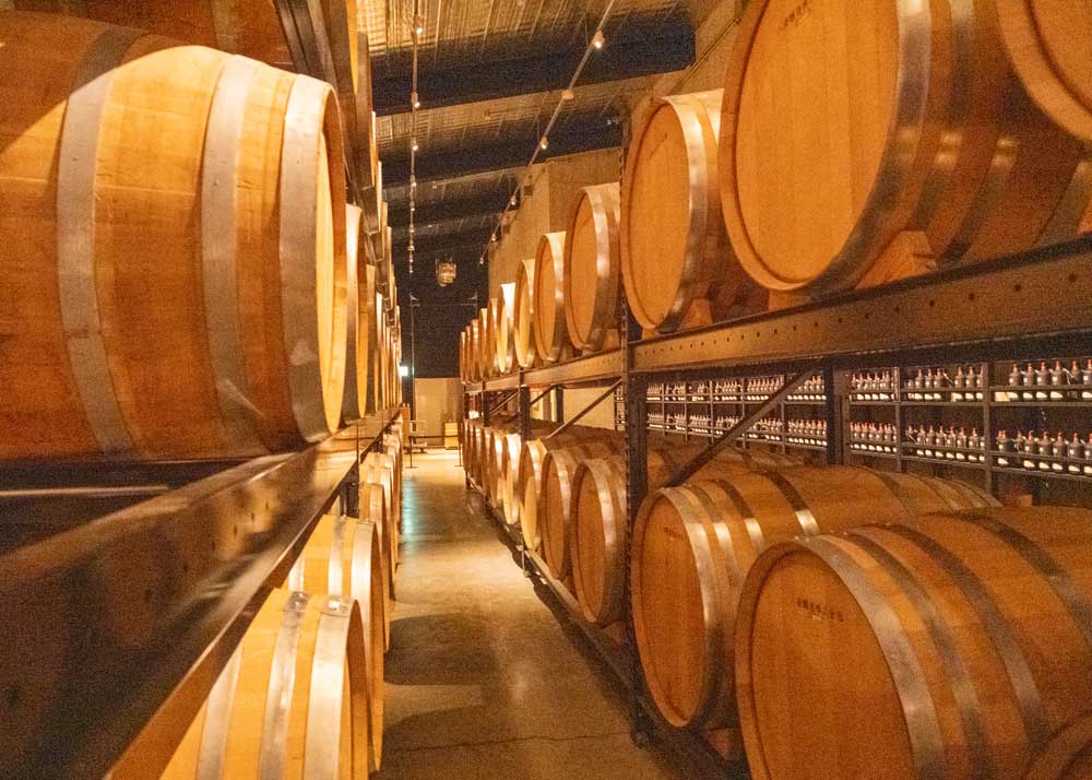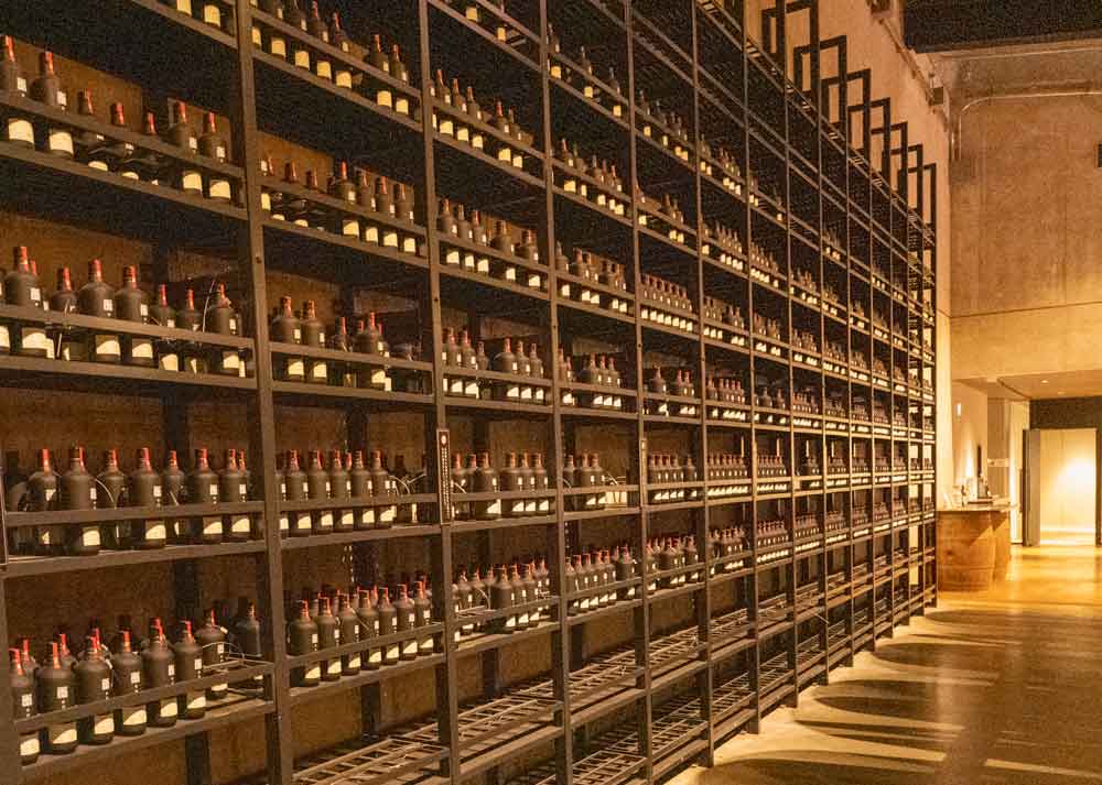| 雪室の横にある半地下式の常温貯蔵室で 米焼酎をオーク樽の中で熟成中 | メモリアル焼酎「面向未来」を預り、保存 する棚、熟成期間を決めて後日届けてくれる |