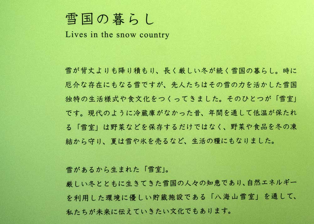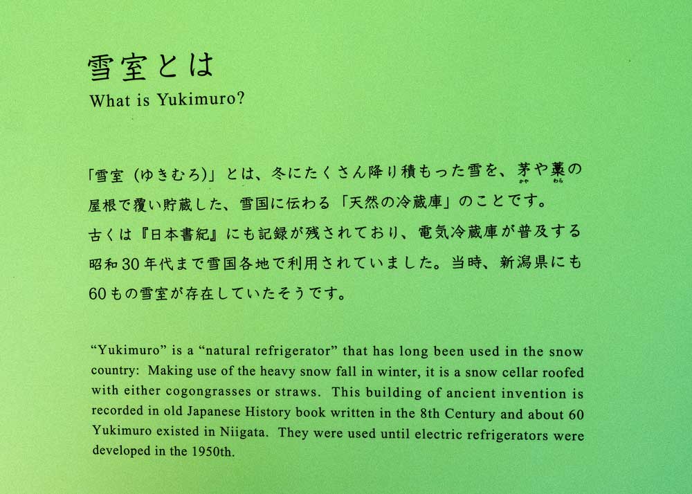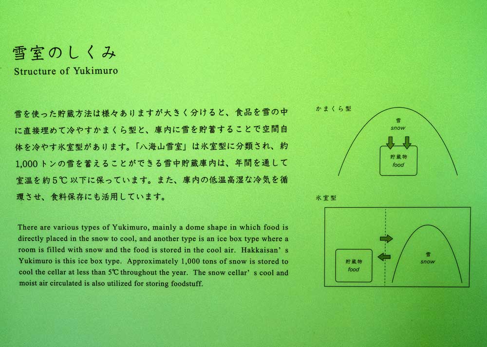 | 八海山雪室 | 食品を雪の中に直接埋めて冷やすかまくら型 と庫内に雪を貯蓄することで空間を冷やす 氷室型があり、八海山雪室は後者の型 |