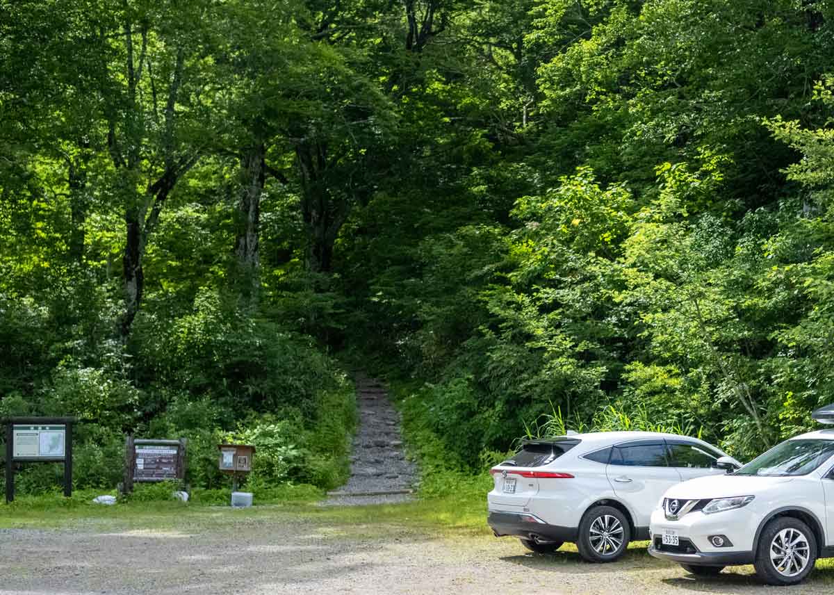 | 小赤沢コースの地形図 GPS軌跡図 | 林道終点にある駐車場 階段右手前に水場がある 階段を上がったところが三合目で標高1310m |