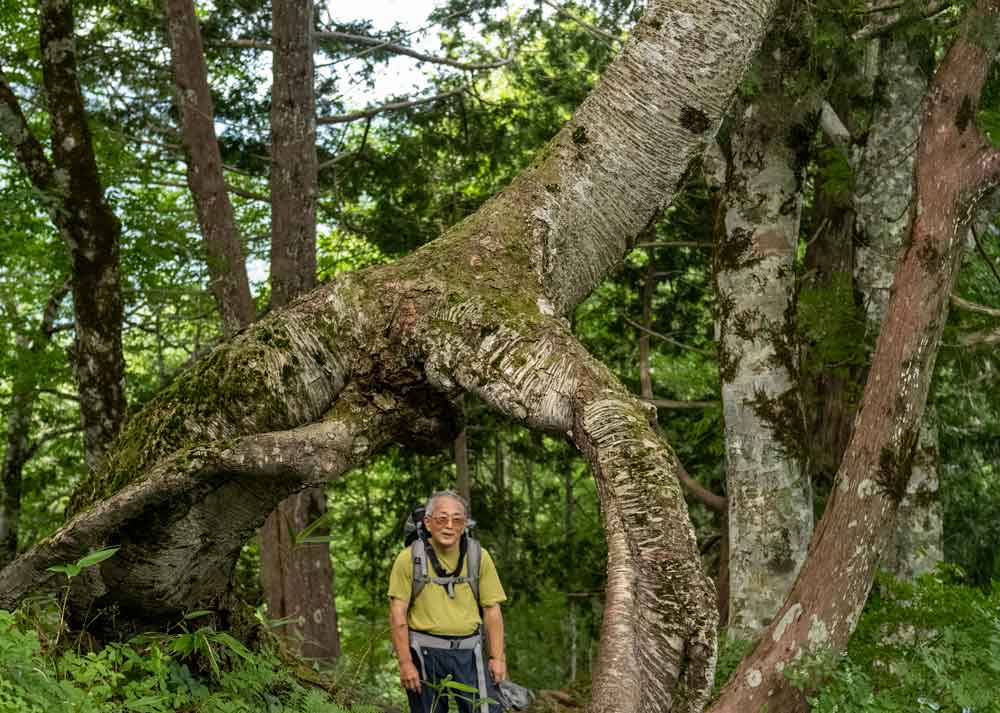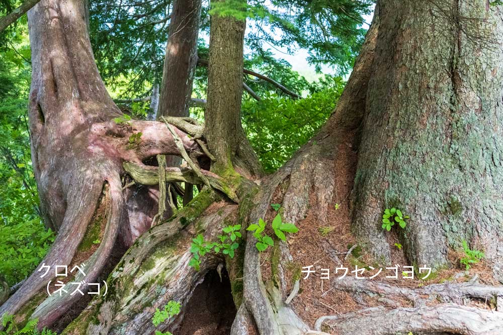 | 登り始めからブナとスギの大木が現われた この根が上がった樹種? | あまり見慣れないクロベとチョウセンゴヨウの巨樹 チョウセンゴヨウは自生のものらしい |