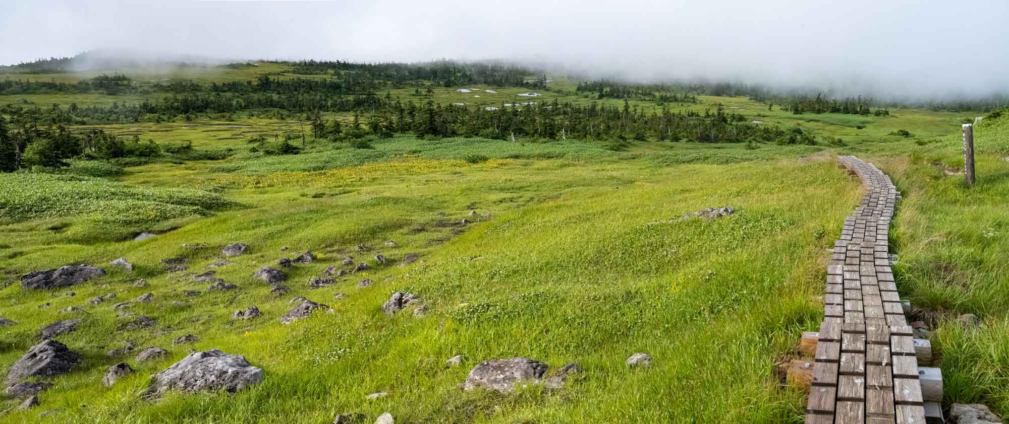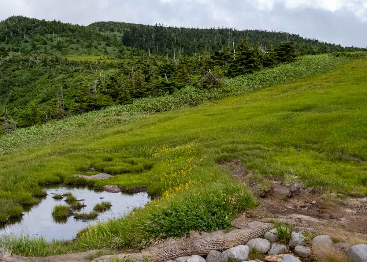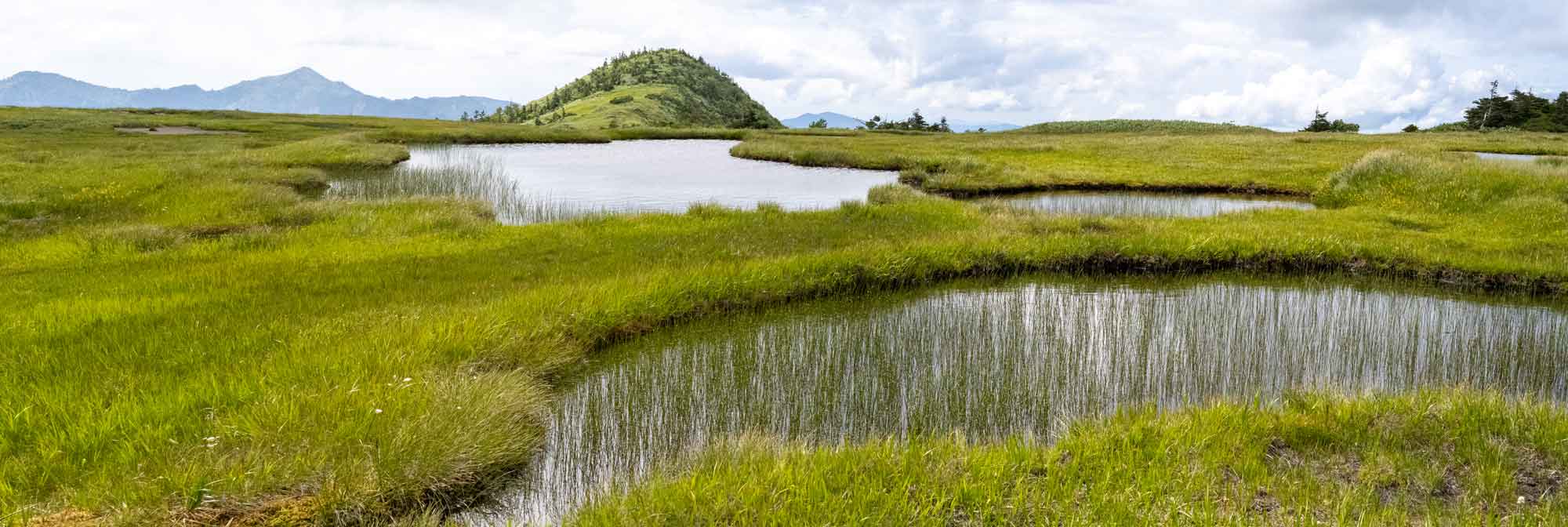 頂上付近には600haにもおよぶ広大な高層湿原とおよそ3000個所の地塘が点在していて、