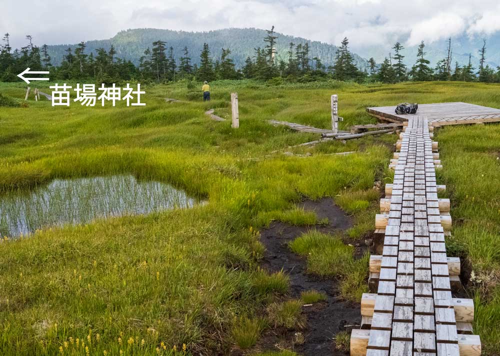 | 湿原に敷かれた新しい木道が続く | オオシラビソの森の中の木道は板敷だった 年内中に新しい木道に掛替えるようだ |