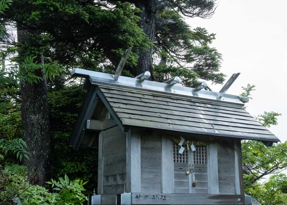 | 帰りに苗場神社に立ち寄った | オオシラビソ大木の下に祀られていた苗場神社 途中で白衣姿の若い神官に出会った |