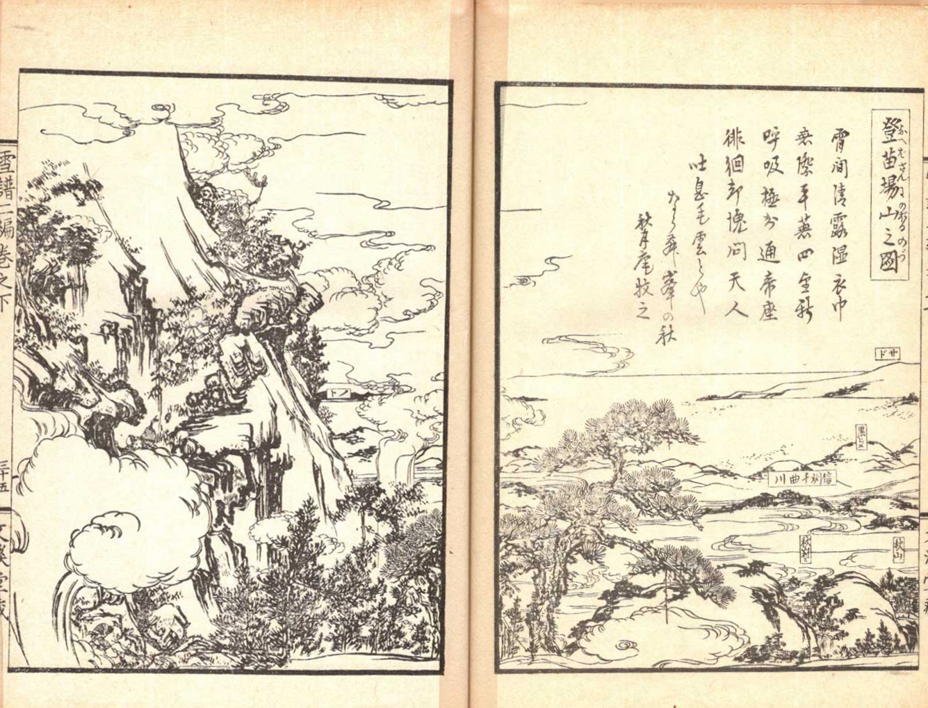 | 苗場山登るの図 絶壁図は神楽岡(現在の神楽ヶ峰)であろうか? 絶壁下にトノ(能登)右図にドサ(佐渡)信州千曲川、秋山などの地名が見える 北越雪譜 野島出版復刻本より |