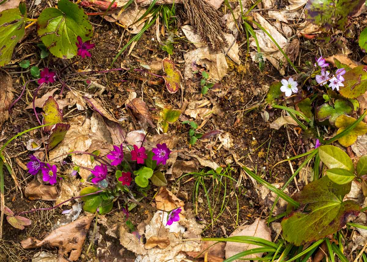 | 35haの里山(標高60~160mほど)に約3万株の雪割草(オオミスミソウ)が群生し、ご覧の通り多くの花色に驚かされる。地元では春の訪れを告げる花として雪割草と呼びなれていて、オオミスミソウとは言わない。 オオミスミソウ(キンポウゲ科)の分布は日本海側で、八ヶ岳などに咲くユキワリソウ(サクラソウ科)とは科名も種類も違う。 |