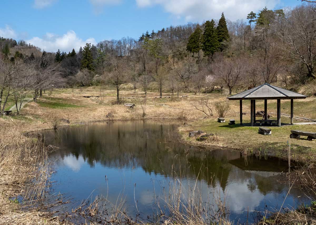 | ミズバショウ | 園内の池と丘陵 |